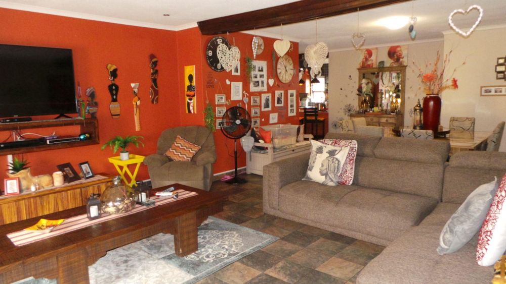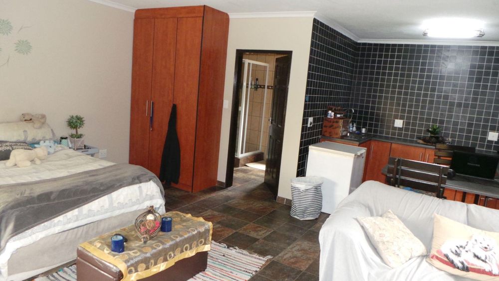 This spacious home offers 3 bedrooms 2 bathrooms ( main bedroom with private bathroom) kitchen, scullery, laundry, lounge, dining, TV lounge ind. BBQ, study, plus 1 bedroom, bathroom Flat with own Prepaid Electricity and Geyser. Front garden with sprinkler system, Water tank, Air conditions, Alarm system with beams and CCTV Camera plus paved driveway and double garage.