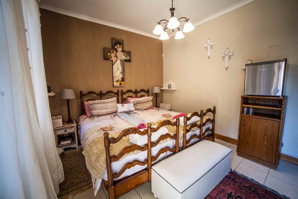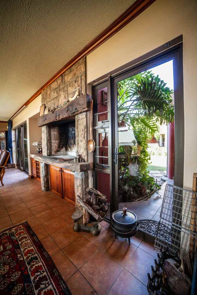 5 bedrooms (3 bedrooms with a lagoon view), 4 bathrooms, guest toilet, large separate tv lounge with indoor BBQ, lounge overlooking the garden, indoor splash pool, large open plan kitchen with scullery and dining area with air-conditioner, library with fire-place, laundry room, 3 garages, large walk-in cool room.
