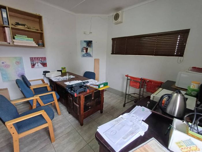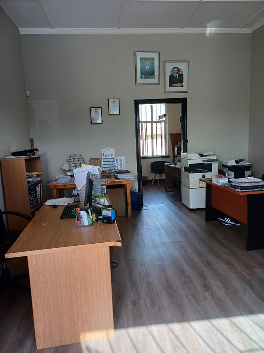 Business property with 4 offices, boardroom, kitchen, bathroom, garage, and bachelor flat available for sale or rent.